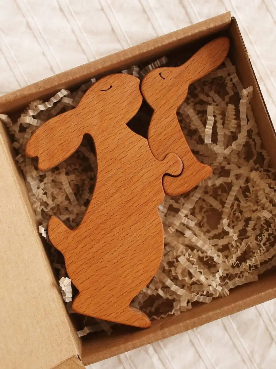 This decorative Easter bunny figurine made of natural wood consists of two parts: a mother rabbit and a baby. This wooden toy makes a wonderful addition to a nursery, living room, or Easter arrangement. This gift figurine is crafted from beech wood and treated with natural linseed oil.